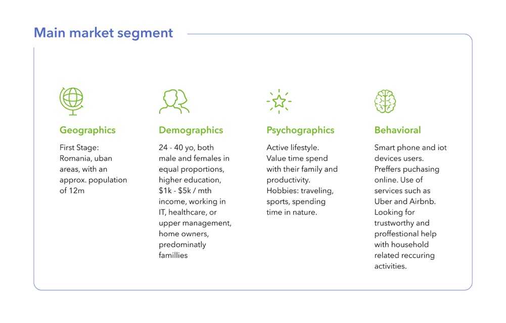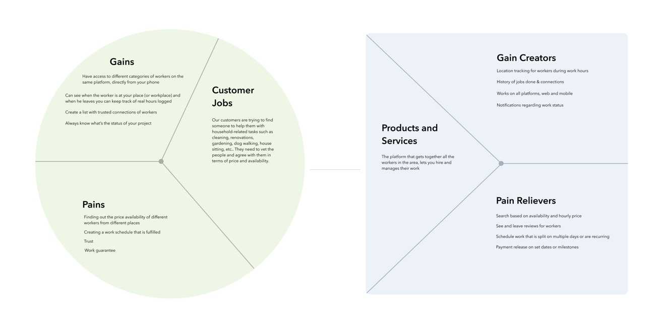 Later, when we decided to really pursue the idea, I started doing more desk research, creating a target group and using tools such as a Market mix or Value Proposition Canvas to help up figure out the right requirements and artifacts for the platform.